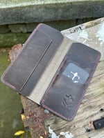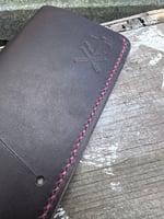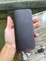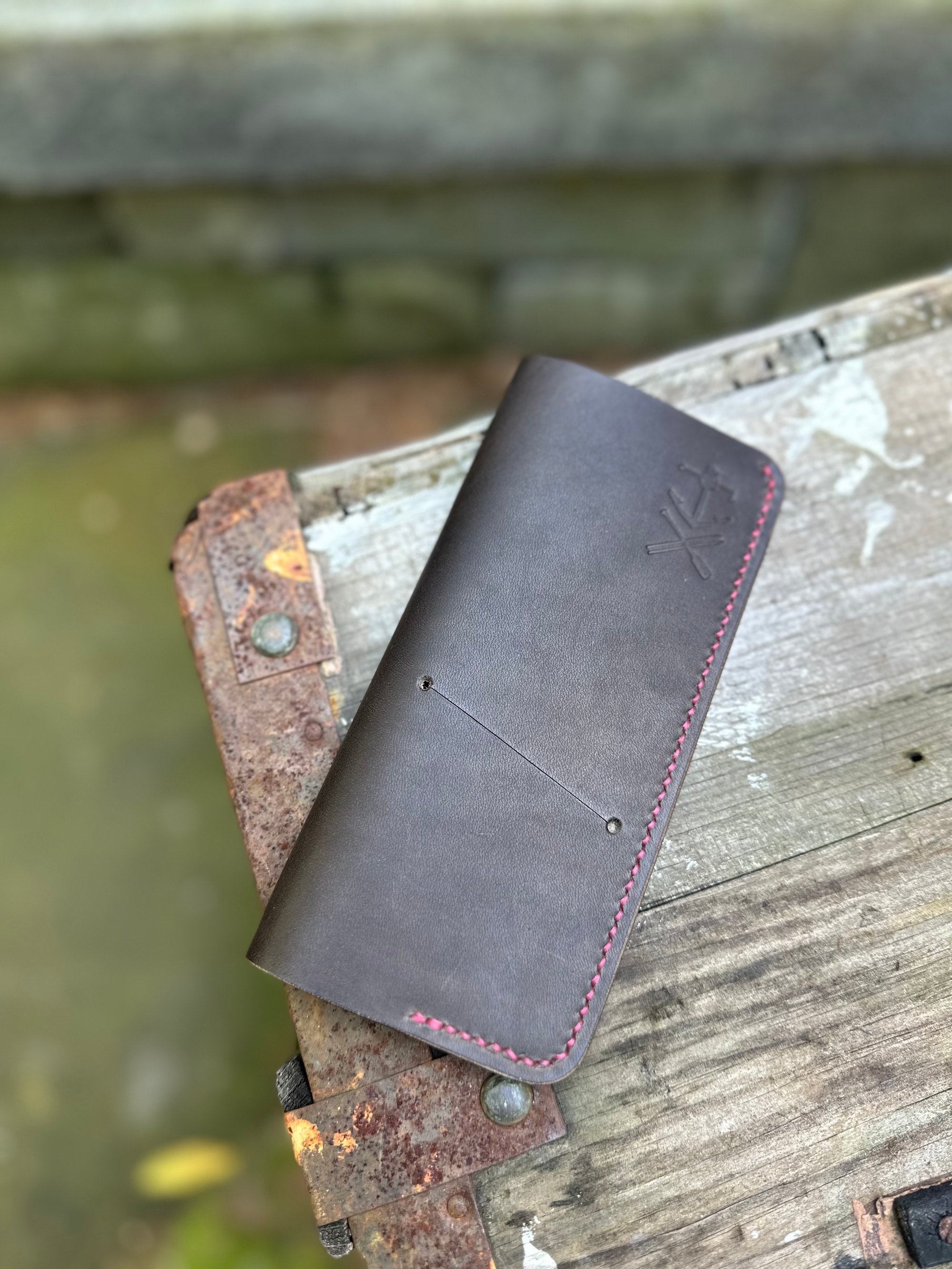 The Tallboy is a traditional "trucker style" tall wallet. This configuration features Wild Moon Harvest leather with hot pink stitching. Features quickdraw card pocket on the front, and 4 additional card pockets inside. Room for cash/checks behind each inner flap.